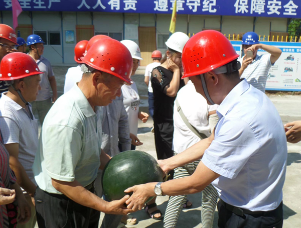 2017年7月13日上午,銅川市住建局副局長郭小放、銅川市新區(qū)管委會副主任張鐵成等相關(guān)人員來到陜西省華源建筑工程有限責(zé)任公司所屬海林御苑項目部,一同慰問在烈日下辛勤勞作的項目部全體員工,并親自為每位員工發(fā)放慰問品。隨后,在陜西省華源建筑工程有限責(zé)任公司總經(jīng)理郝曉兵、海林御苑項目經(jīng)理馮中樓等人員的陪同下,對海林御苑施工現(xiàn)場進(jìn)行了高溫作業(yè)環(huán)境檢查,要求一定要抓好夏季安全生產(chǎn)工作,杜絕一切安全隱患的發(fā)生,根據(jù)高溫季節(jié)特點,合理安排工人作息時間,落實防暑降溫措施,盡量改善現(xiàn)場作業(yè)人員的工作和生活條件,一定要把安全放在首位。(楊楠)